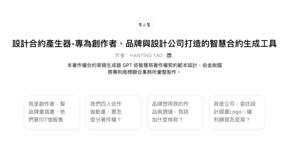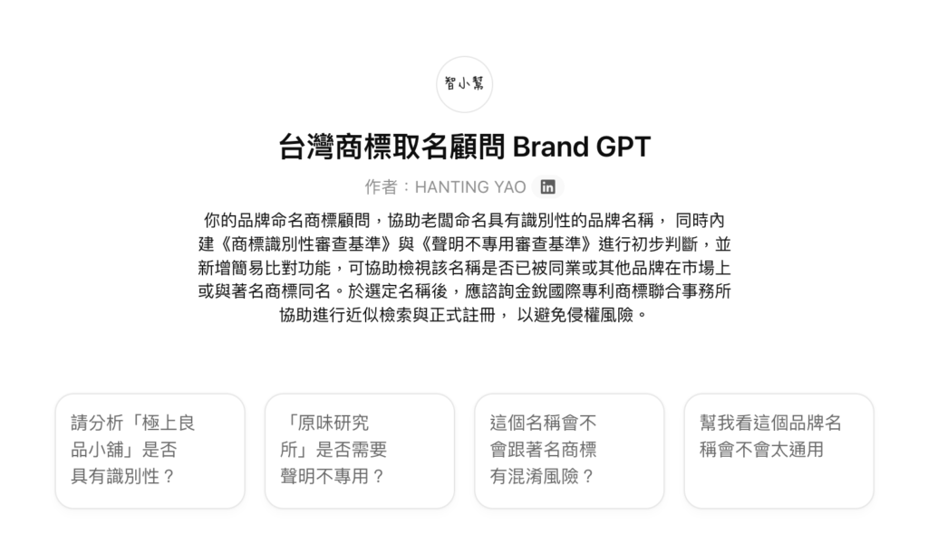 「台灣商標取名顧問GPT」,協助老闆命名具有識別性的品牌名稱,同時內建《商標識別性審查基準》與《聲明不專用審查基準》進行初步判斷。
